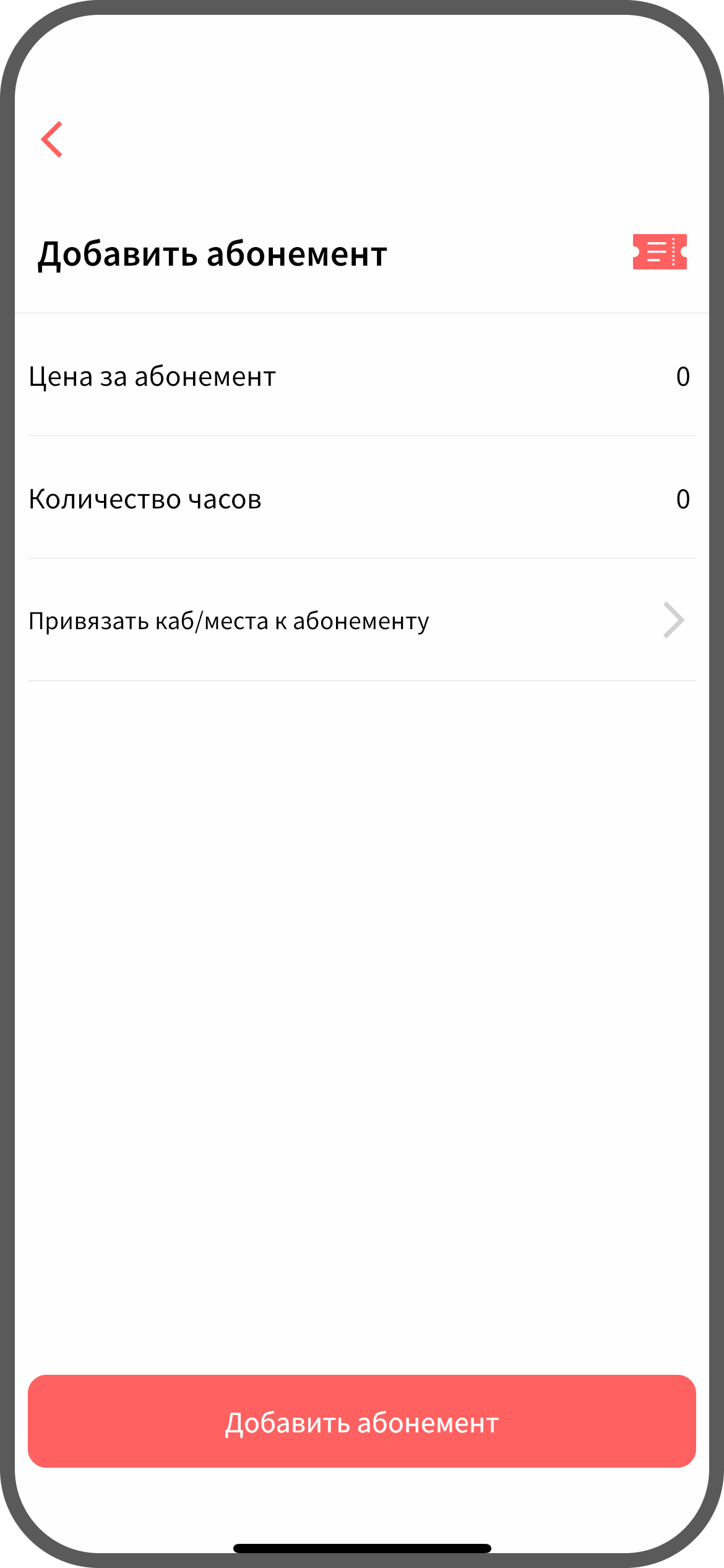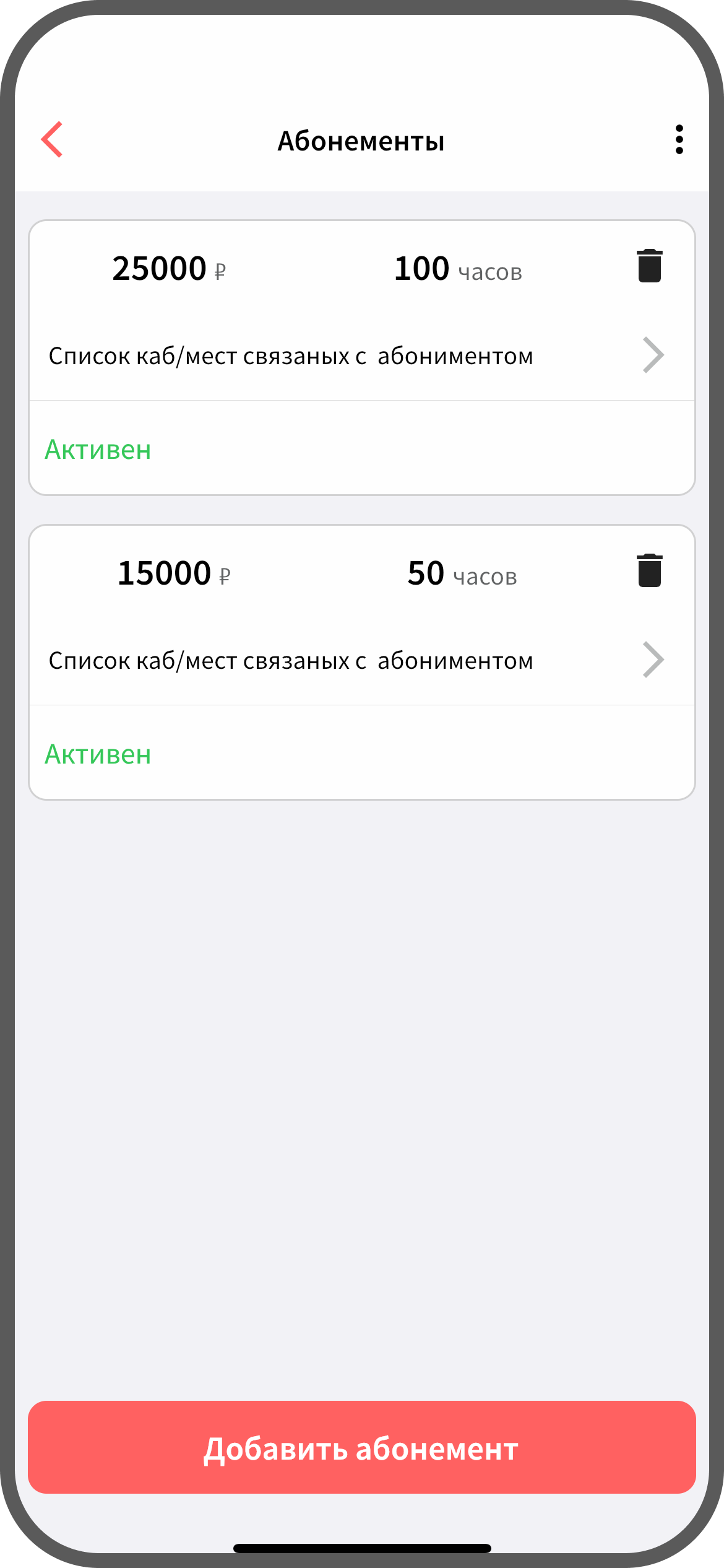 В этом разделе собственник может увидеть список абонементов которые действуют для покупки. Каждый абонемент можно прикрепить к списку мест или кабинетов.