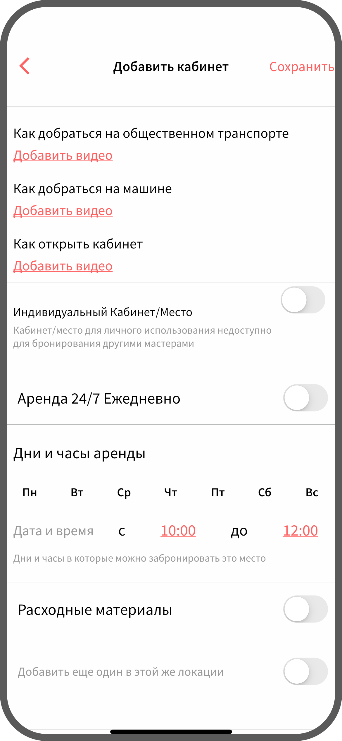 В этом разделе можно добавить место или кабинет и настроить график работы, цены, загрузить фотографии кабинета (места) и указать стоимость аренды за час или день аренды и многое другое.